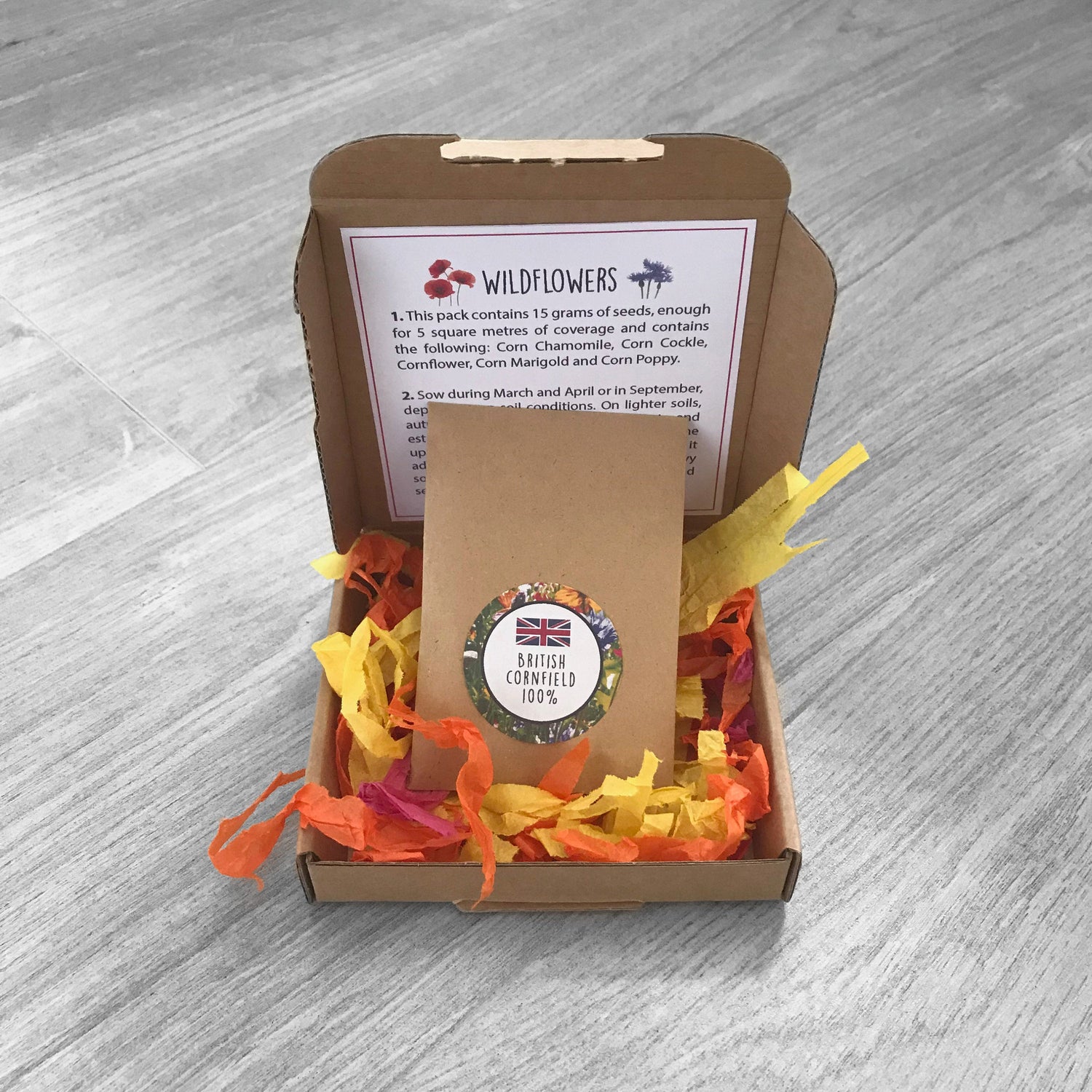 Inside the box is everything you require to start growing. You won't need any existing tools or skills. Our wildflower kit contains 10 grams of seeds, enough for 3 square metres of coverage; a traditional English mix of wildflowers including corn chamomile, corn cockle, cornflower, marigold corn poppy and sunflowers.